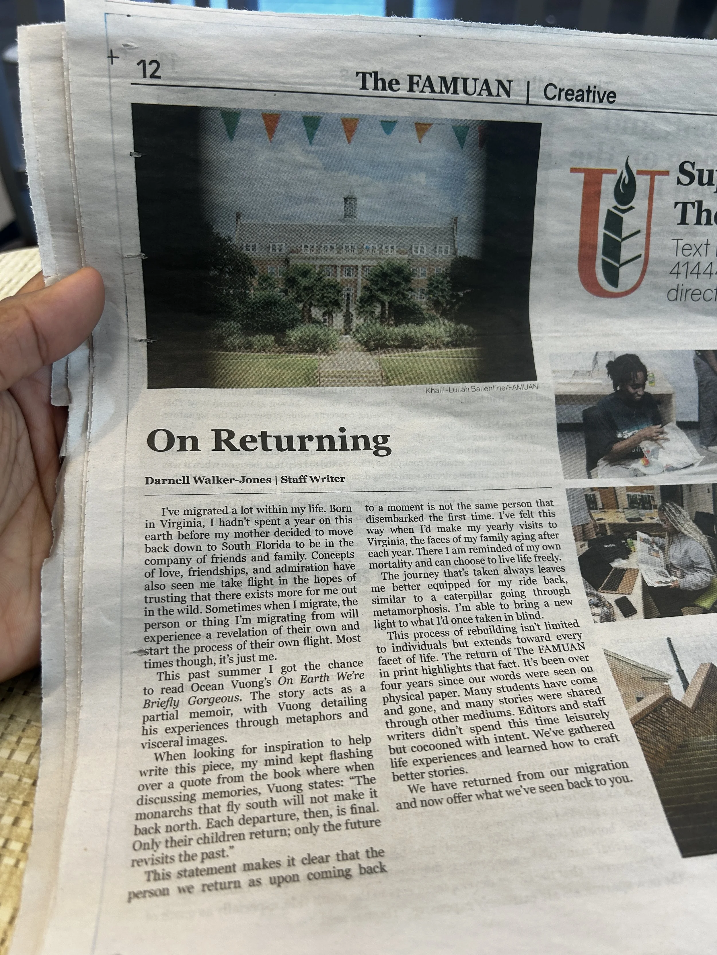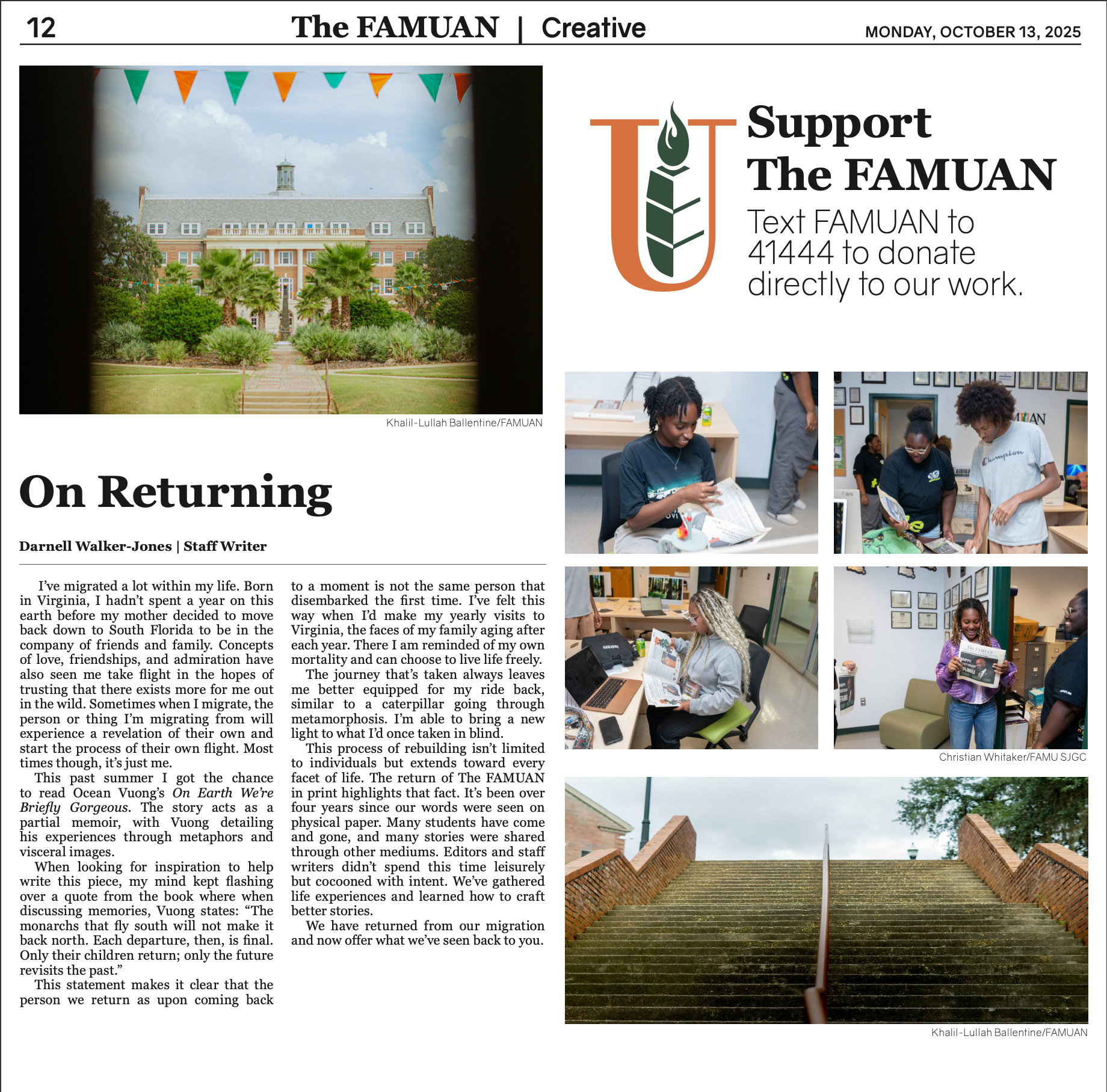 The journey that's taken always leaves me better equipped for my ride back, similar to a caterpillar going through metamorphosis. I’m able to bring a new light to what I’d once taken in blind. This process of rebuilding isn’t limited to individuals but extends toward every facet of life. The return of The FAMUAN in print highlights that fact. It’s been over four years since our words were seen on physical paper. Many students have come and gone, and many stories were shared through other mediums. Editors and staff writers didn’t spend this time leisurely, but cococooned with intent. We’ve gathered life experiences and learned how to craft better stories. We have returned from our migration, and now offer what we’ve seen back to you.